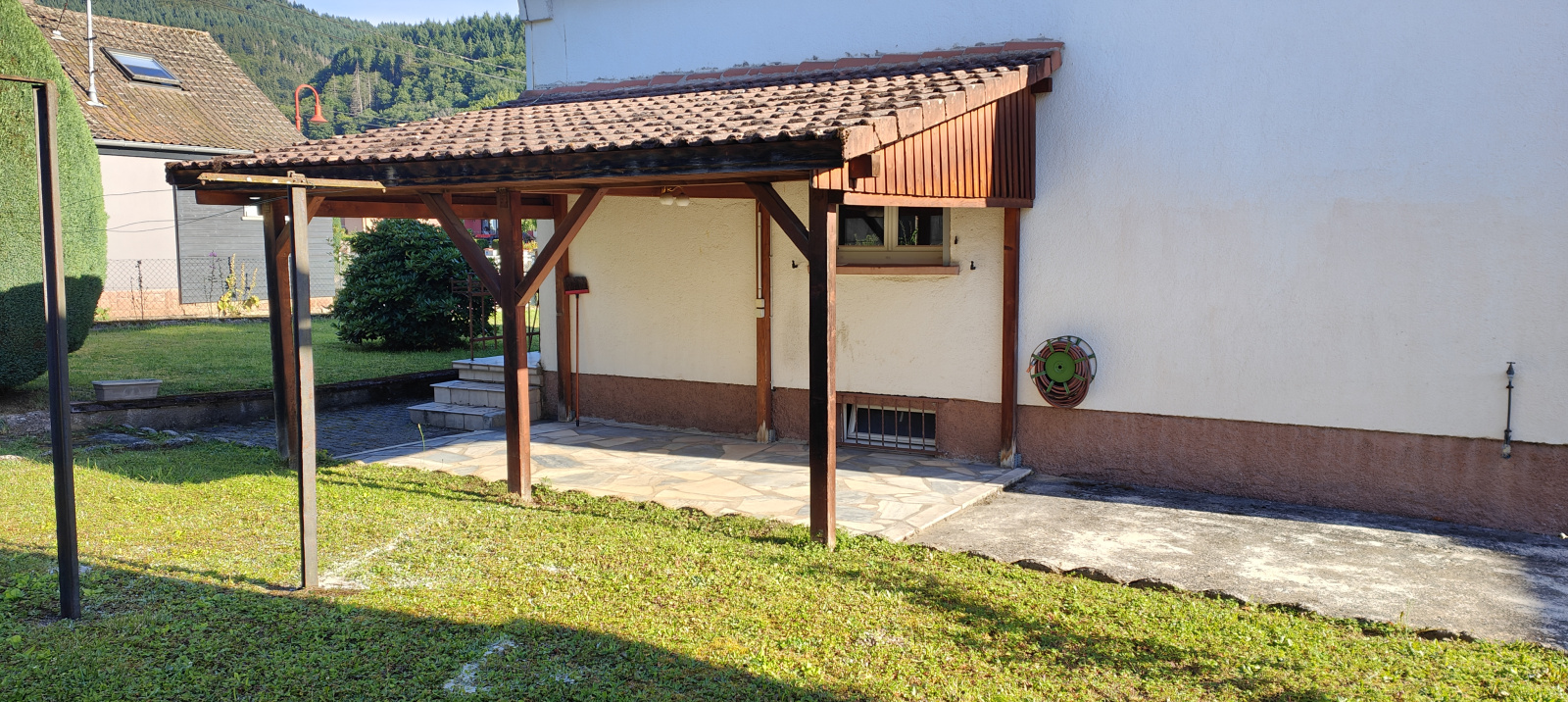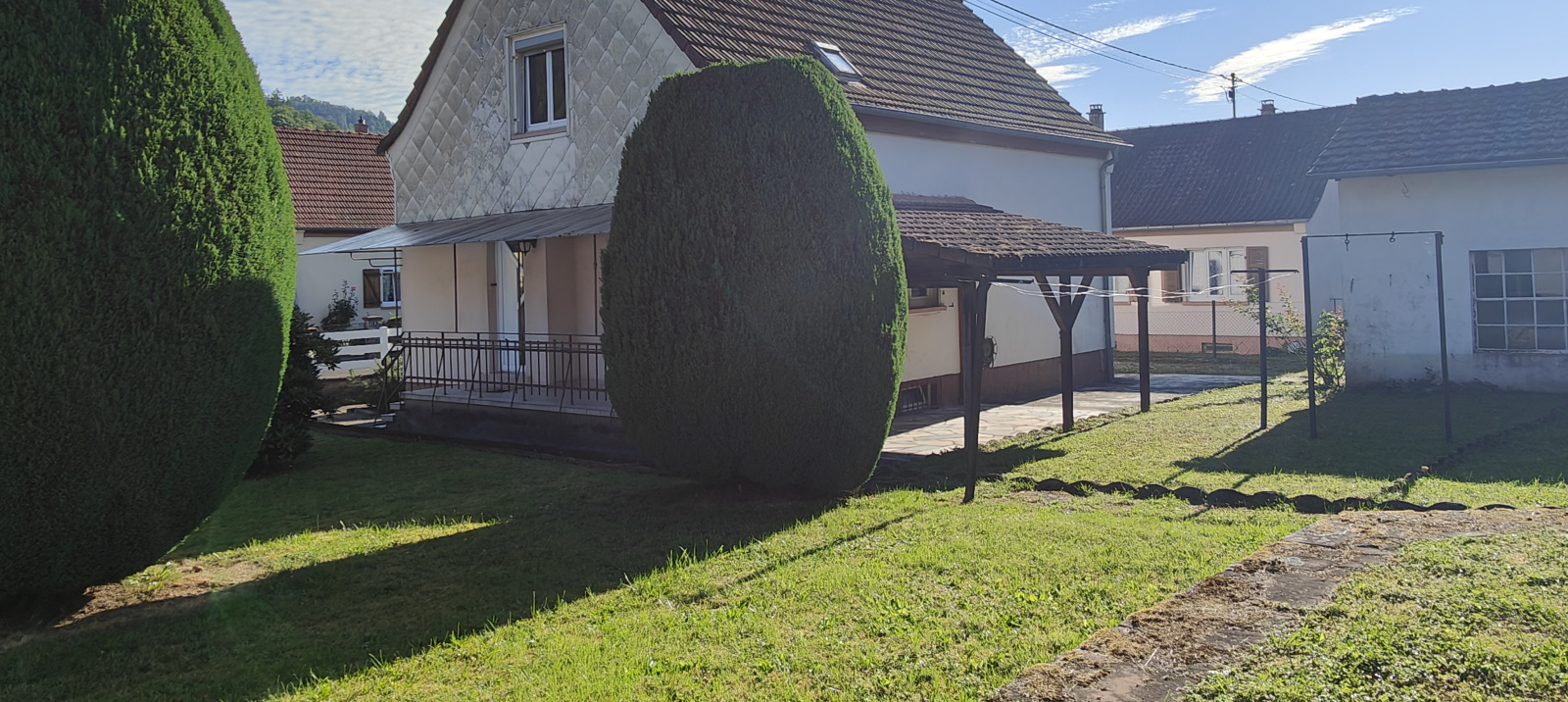 Le terrain de 5.37 ares est entièrement plat, clôturé (portail électrique) et aménagé avec un agréable espace vert. Une terrasse couverte orientée plein Sud vous permettra de profiter des beaux jours. Aussi, un garage en annexe accueille un véhicule puis du rangement au-dessus. La propriété offre également des possibilités de stationnement pour plusieurs véhicules. Aussi, des places communales sont disponibles dans la rue.