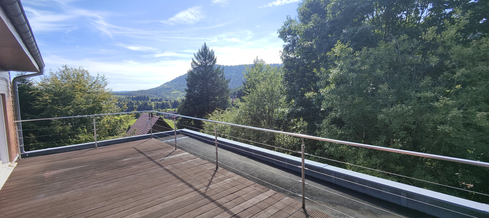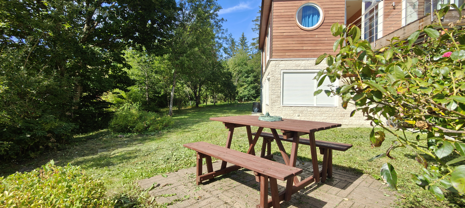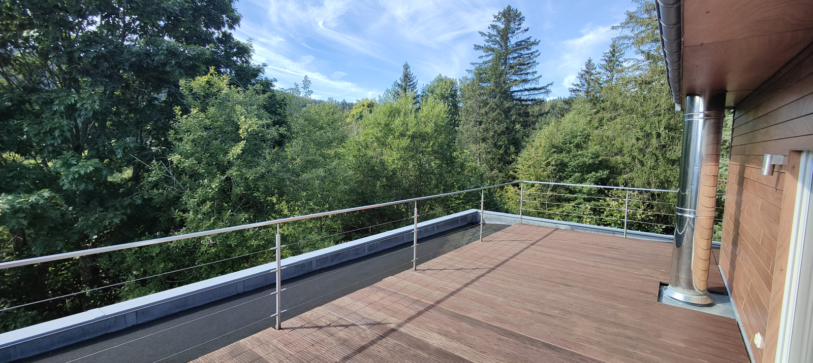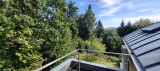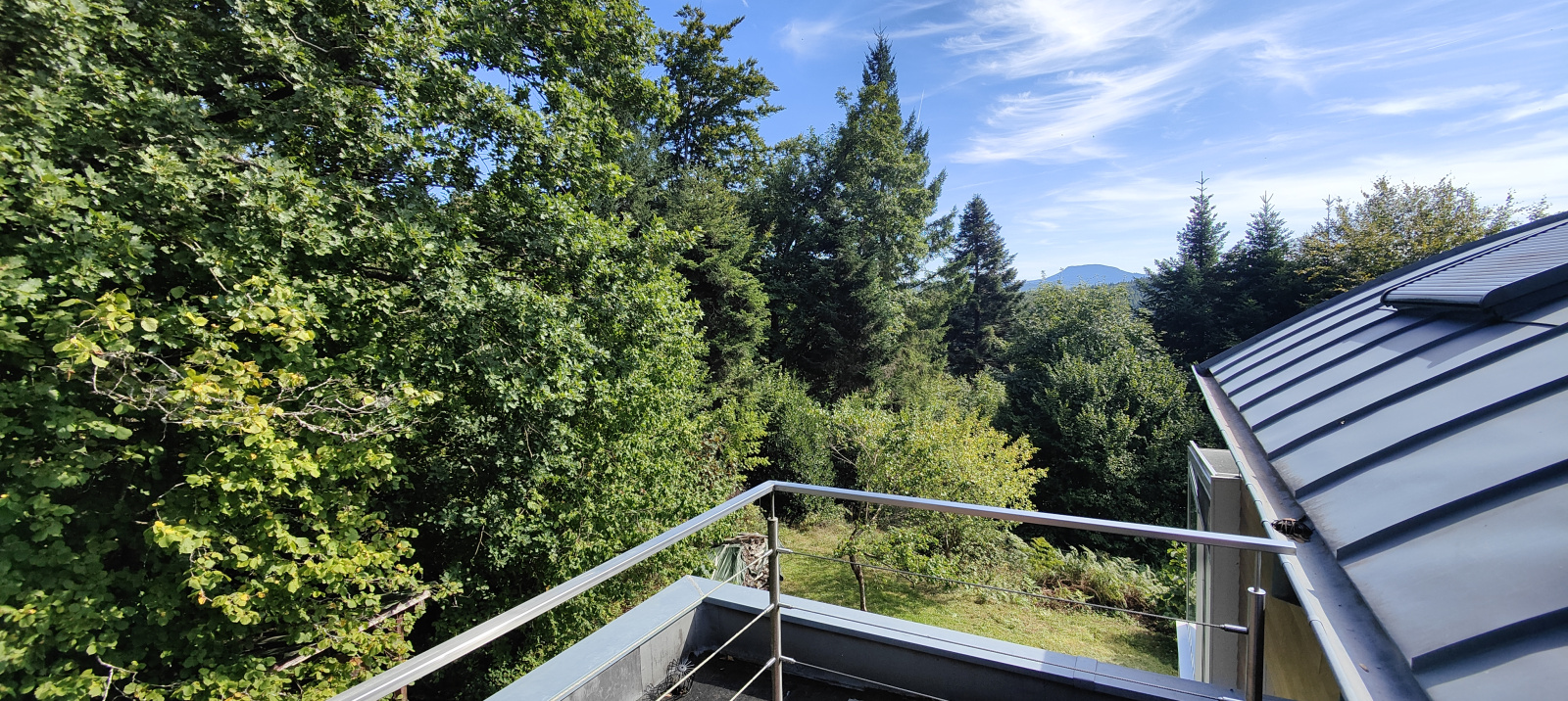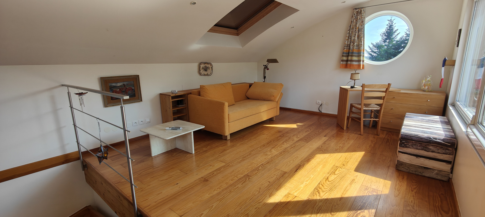À l'étage, une spacieuse mezzanine de plus de 18 m² au sol en parquet, chaleureuse et lumineuse, vous conduit à une grande terrasse qui entoure la maison sur trois côtés. Cet espace extérieur, à l'abri des regards, offre une vue dominante et splendide sur les environs.