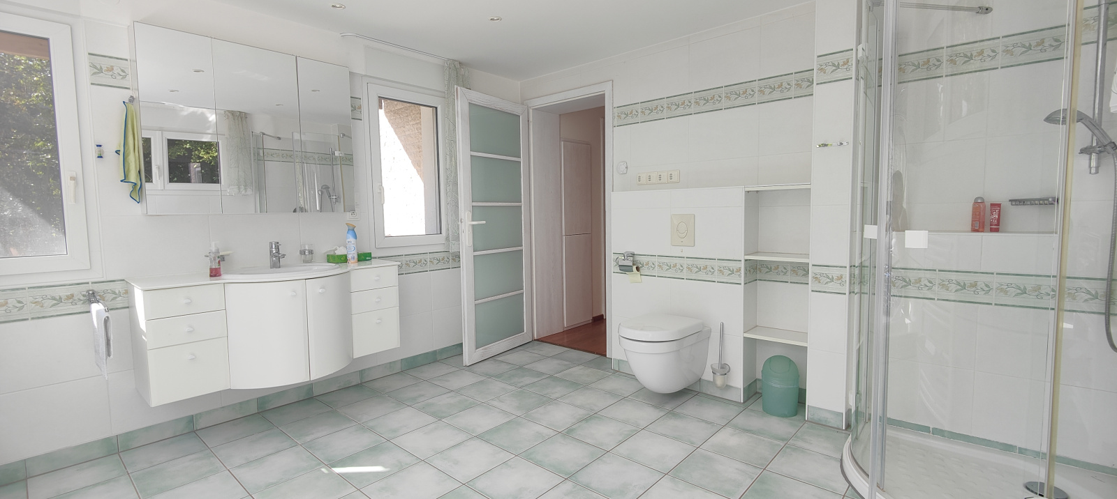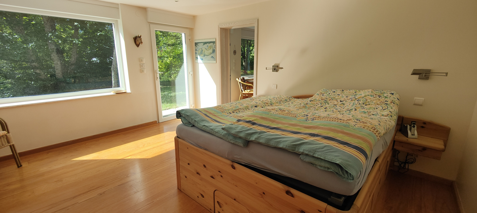 Au rez-de-chaussée inférieur, deux grandes chambres (17 et 18 m²) bénéficient d'un accès direct à l'extérieur. Ce niveau inclut également une grande salle de bain de 13 m² avec toilette et une buanderie.