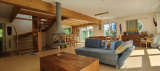 Au rez-de-chaussée surélevé, l'espace de vie est spectaculaire : un salon-salle à manger de près de 45 m² ouvert sur une cuisine de 12 m². Les larges baies vitrées et fenêtres allant jusqu'au sol offrent une luminosité exceptionnelle et une immersion totale dans les environs. La pièce de vie s'illumine sous le marbre d'Indonésie au sol, un matériau noble qui confère une élégance rare et intemporelle à l'ensemble.