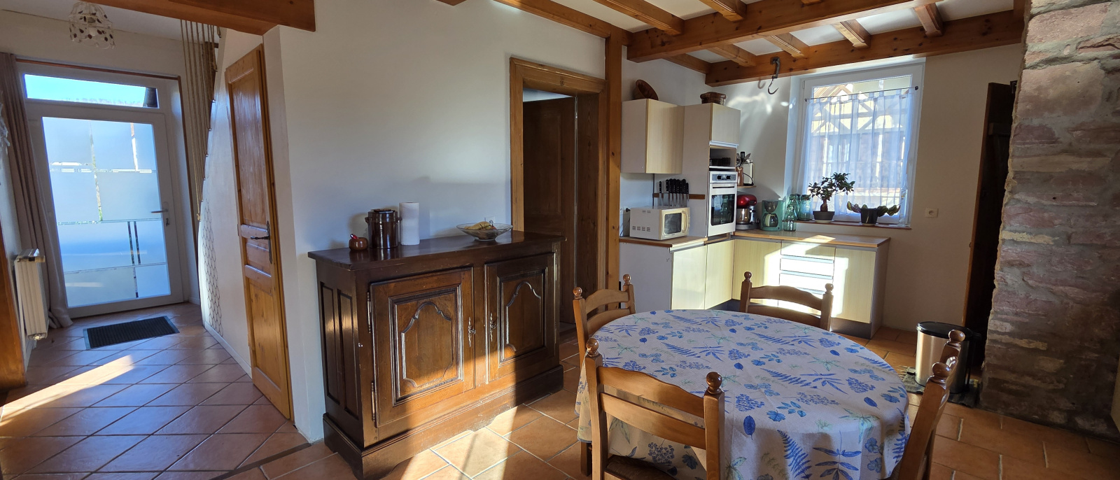 L'espace de vie privilégie une véritable connexion avec l'extérieur : une porte-fenêtre installée dans la salle à manger permet de rejoindre directement l'extérieur, offrant une transition fluide vers le jardin (il restera simplement à créer l'escalier d'accès pour parfaire cet aménagement).