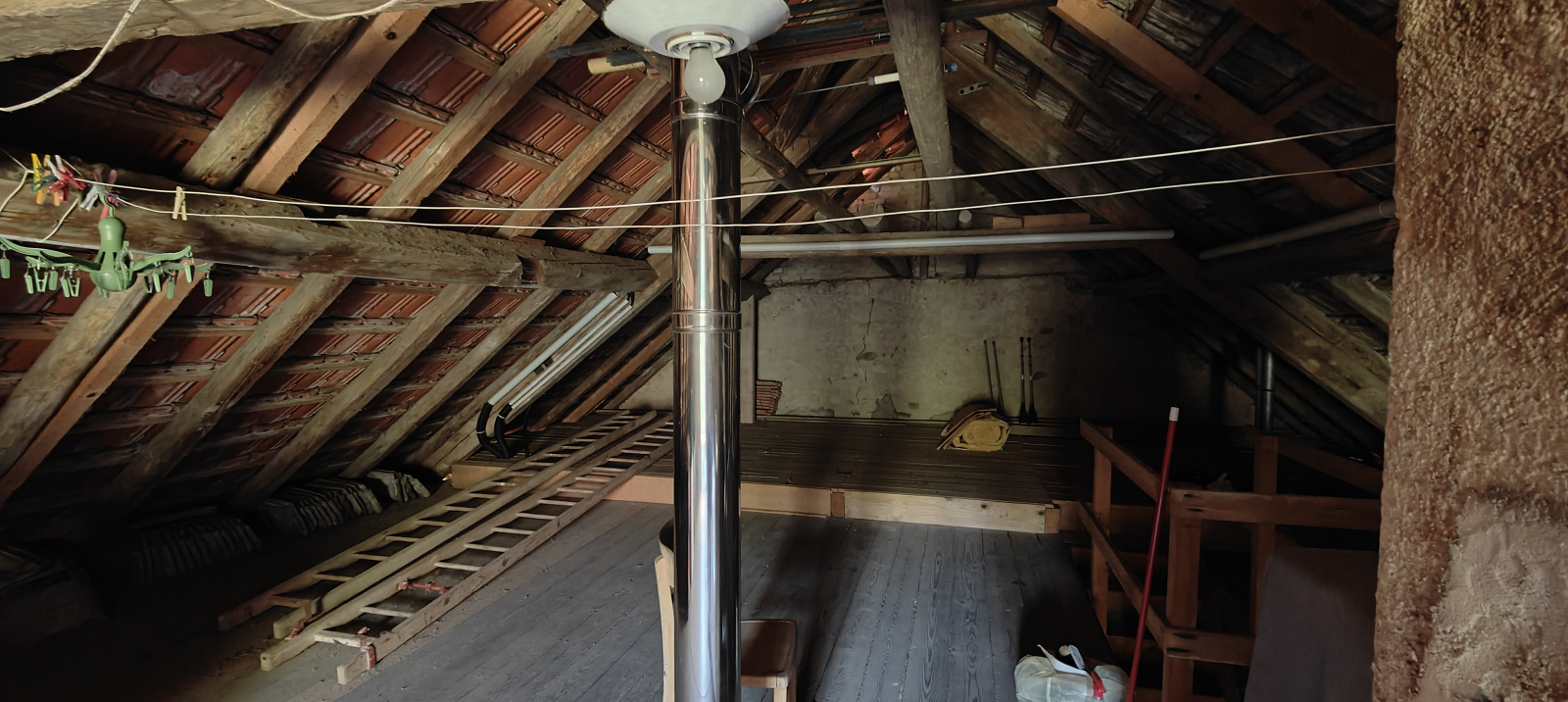 Cet espace de vie est chauffé par un poêle à bois au rez-de-chaussée puis par un poêle à pellets à l'étage. Tous deux sont raccordés à deux conduits différents et tous deux sont tubés. Aussi, des prises électriques sont prévues pour raccorder des convecteurs, si vous le souhaitez.