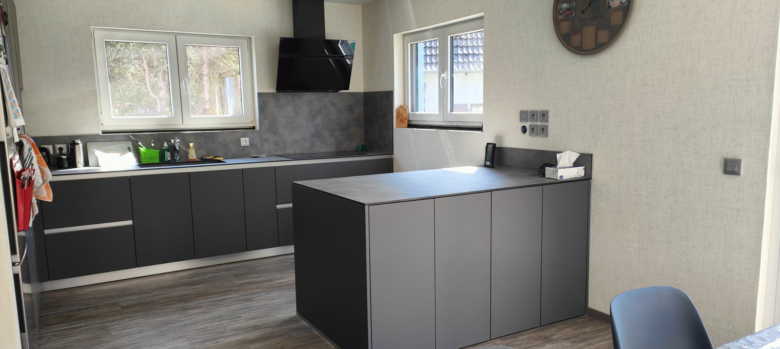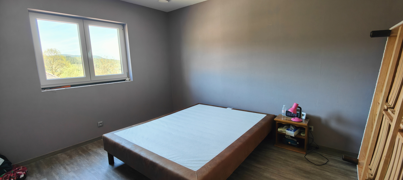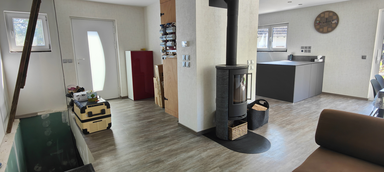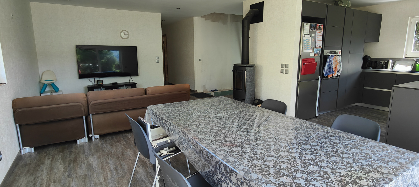 Actuellement un poêle à bois chauffe l'ensemble des pièces, un circuit chauffant est toutefois installé au sol en prévision d'une installation d'une pompe à chaleur.