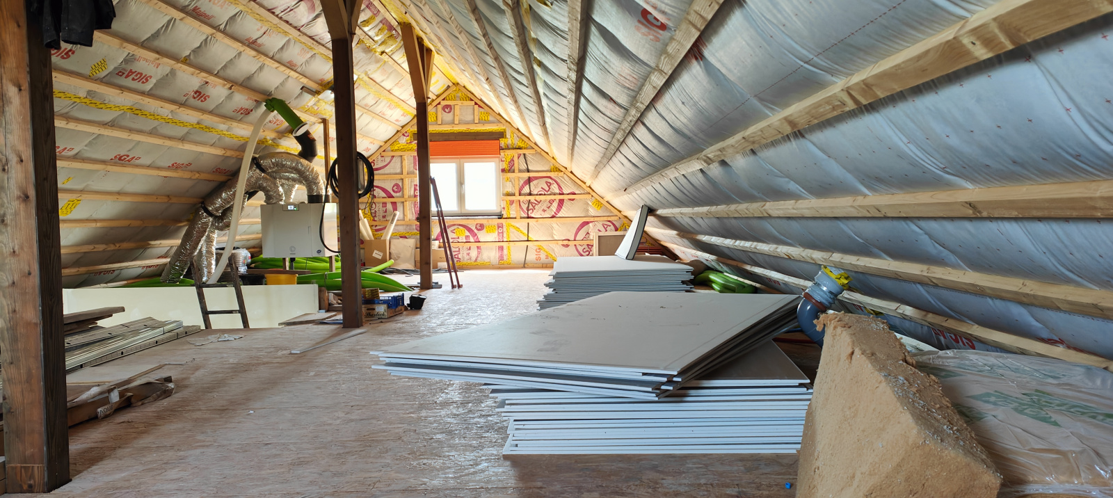 Cette maison est bâtie en ossature bois et dispose de matériaux très performants et conformes aux exigences thermiques actuelles, ouate de cellulose et fibre de bois ont été utilisés pour les murs et la toiture.