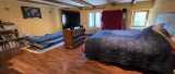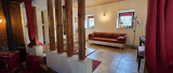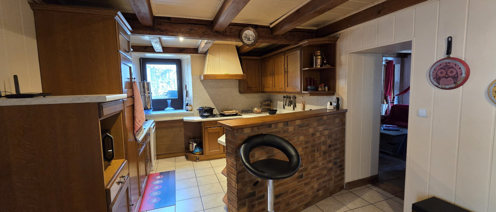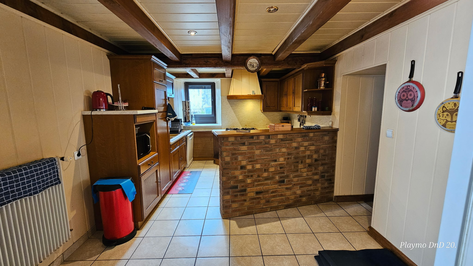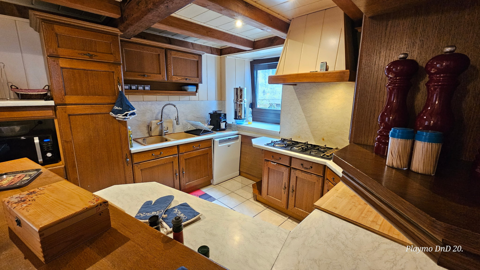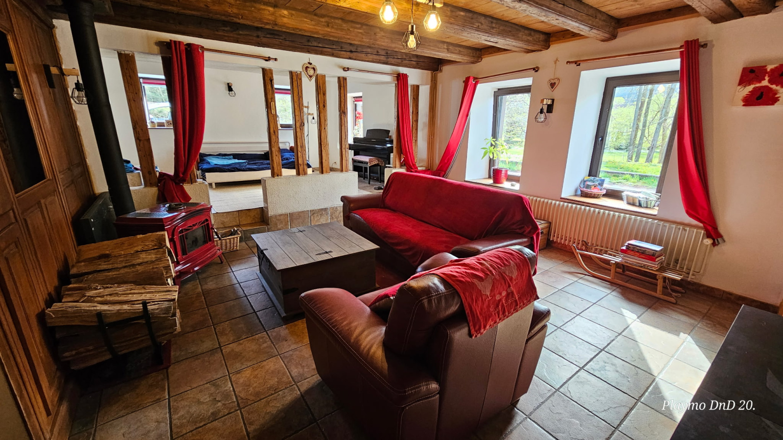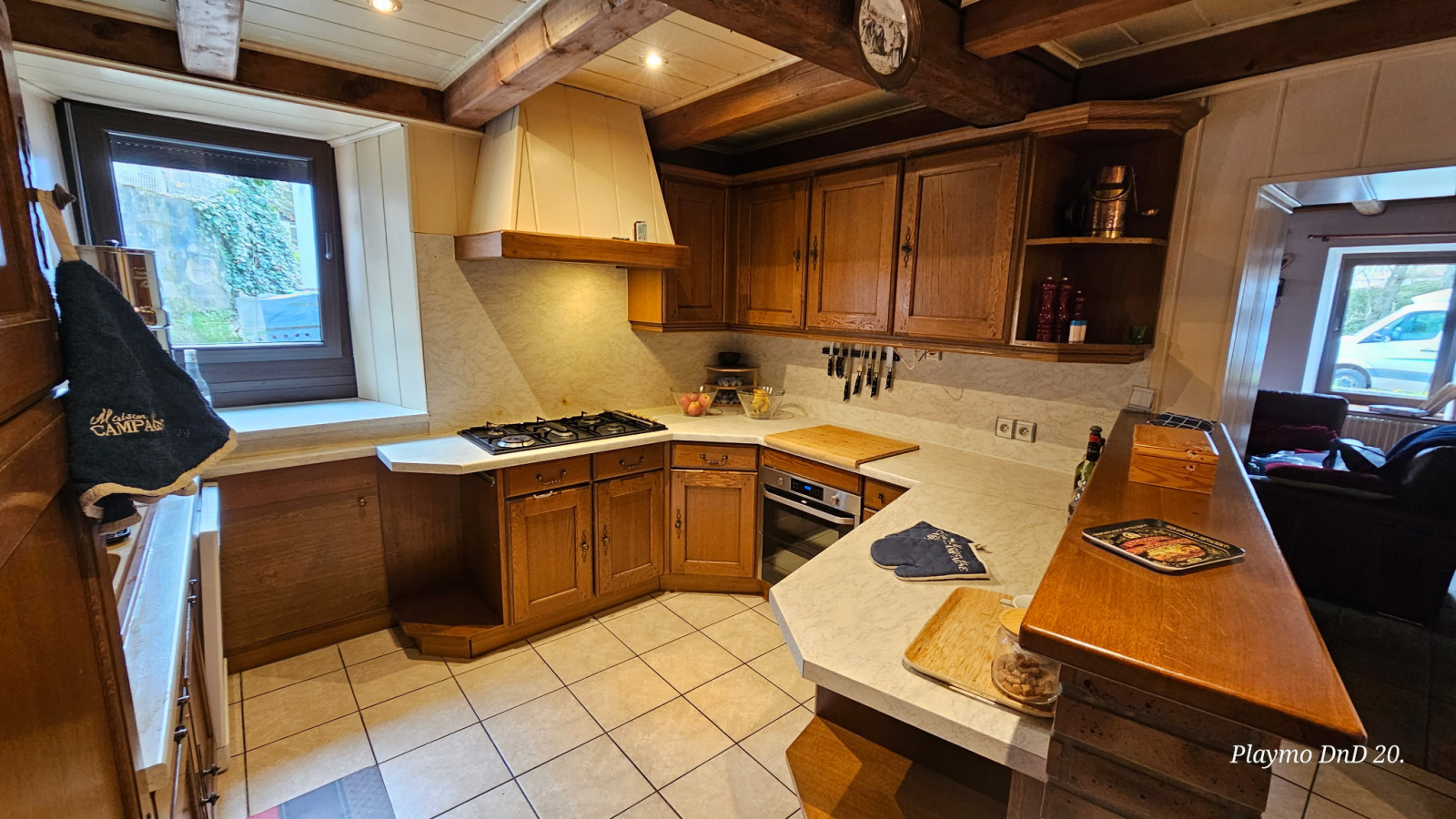 Le rez-de-chaussée dispose d’une entrée principale et d’une entrée arrière pratique, donnant directement sur la cuisine, idéale pour les usages quotidiens. La cuisine est équipée, fonctionnelle et correctement agencée, communicante avec un vaste salon et séjour de plus de 40 m². Cet espace de vie est agrémenté d’un poêle à bois, créant une atmosphère chaleureuse.