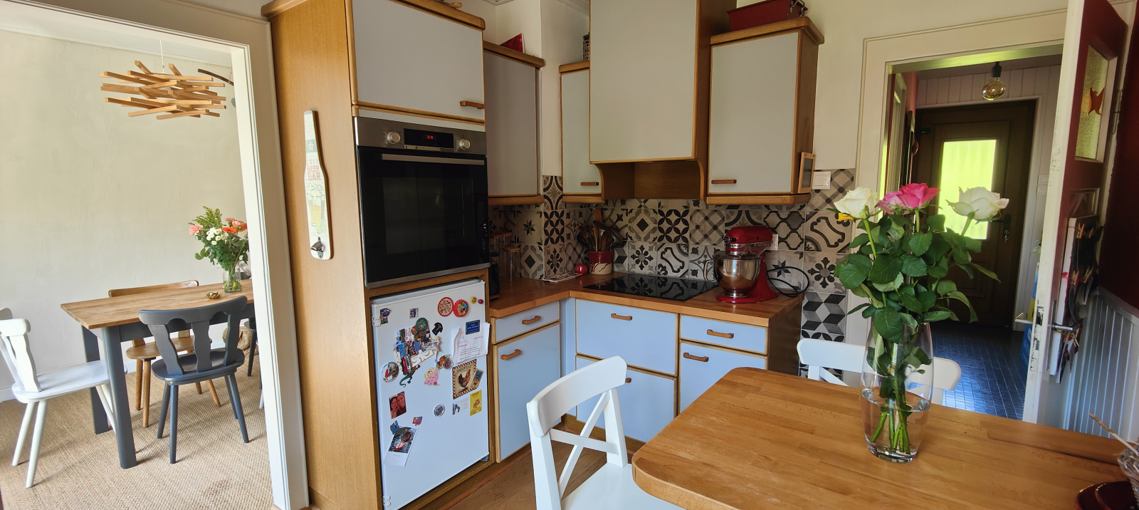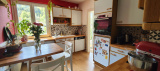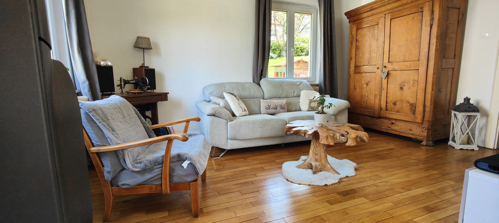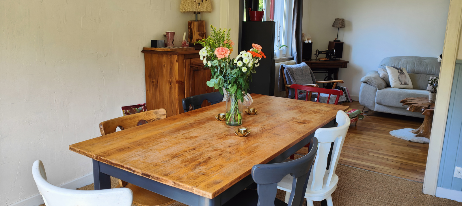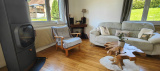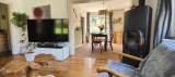 Tout d'abord, un très accueillant salon séjour permettant de rejoindre la cuisine équipée. Depuis cet espace de vie, vous profiterez d'un poêle à bois installé récemment (avec conduit tubé) et très performant qui permet de chauffer l'ensemble de la maison.