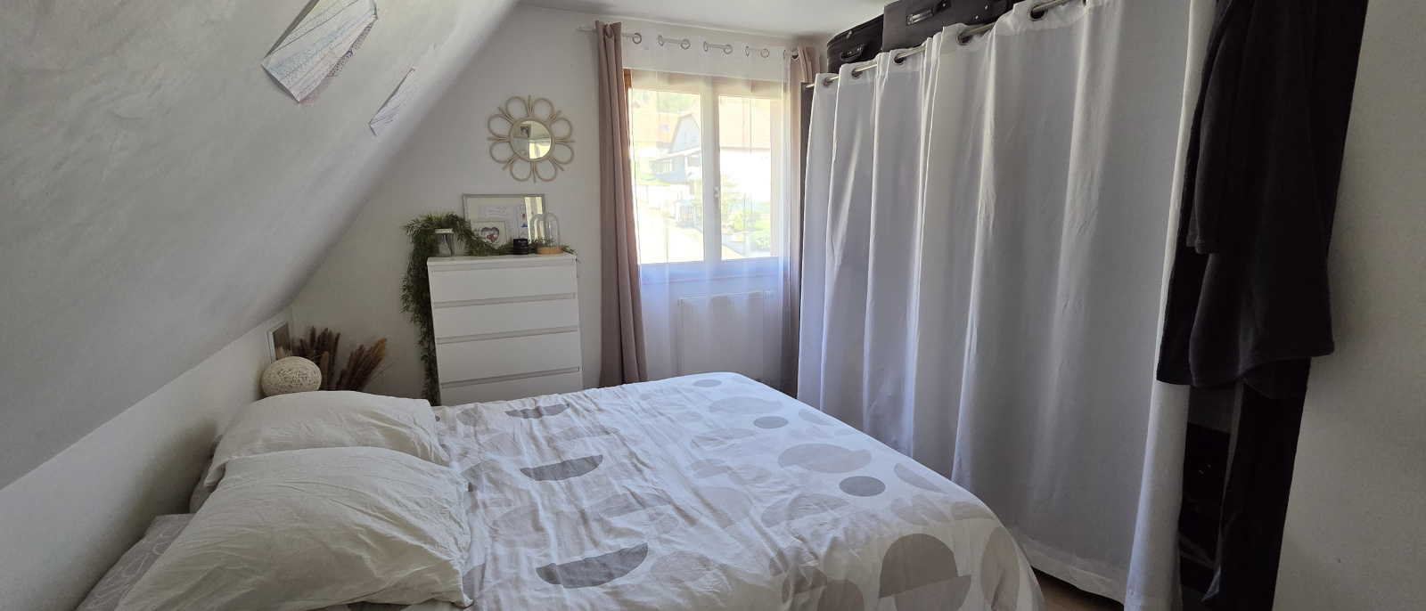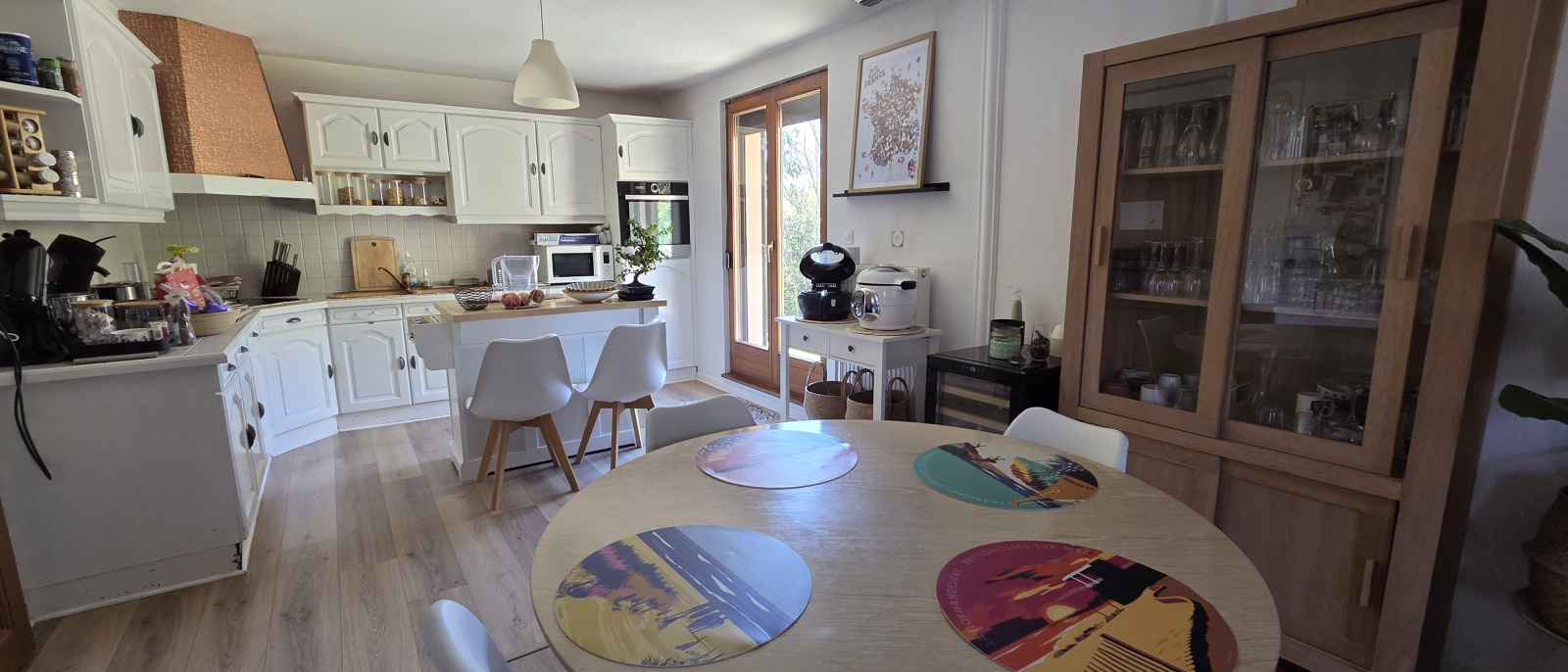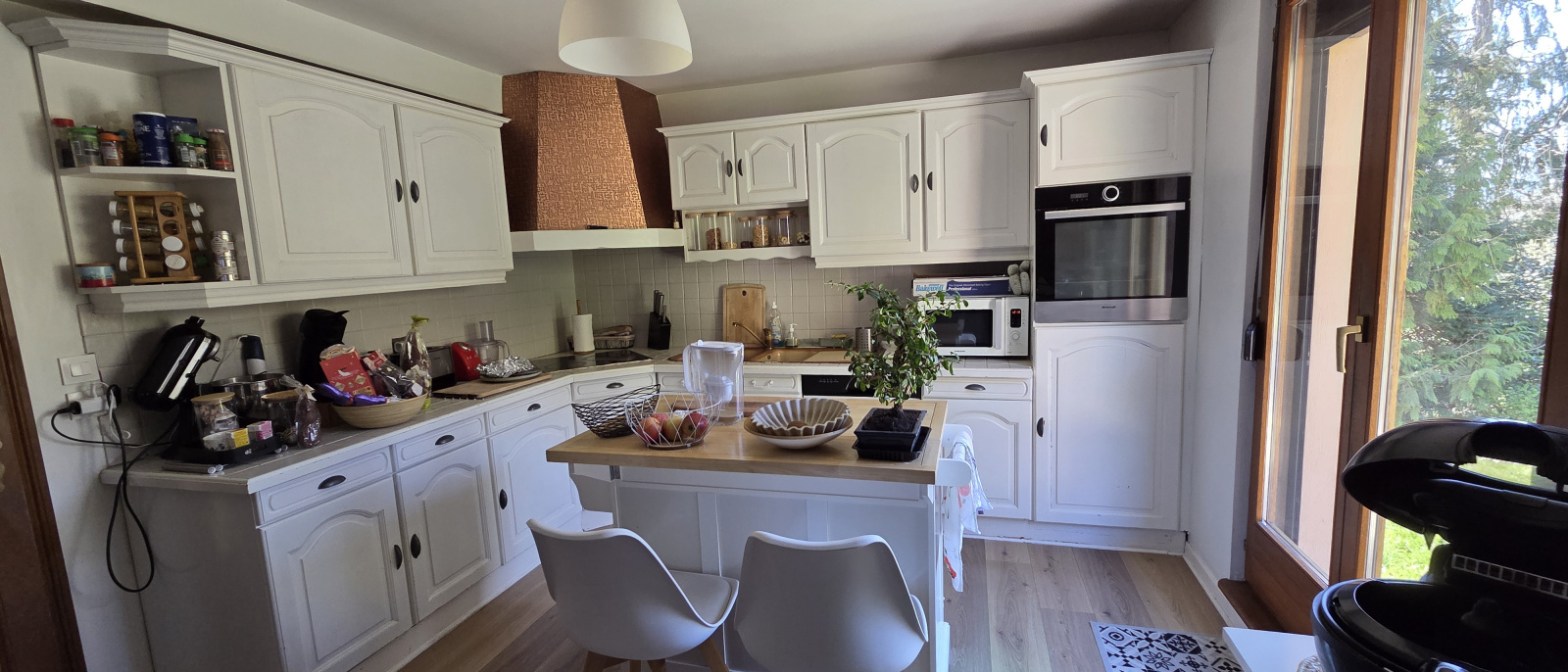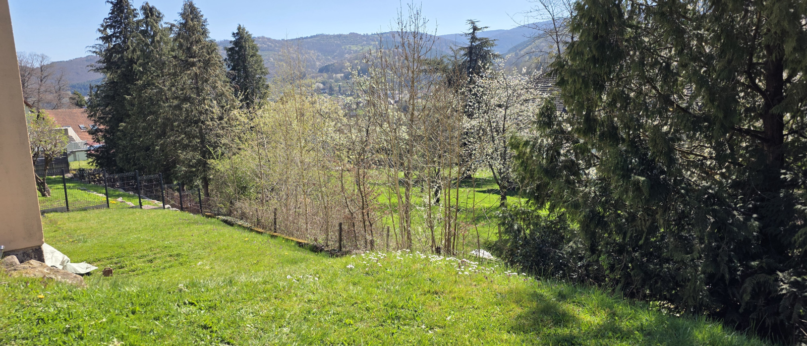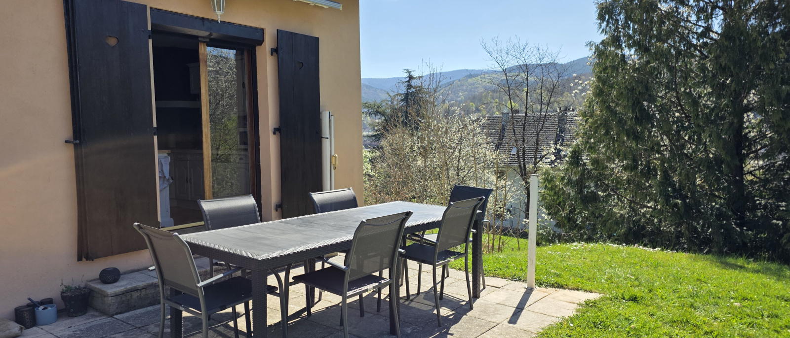 Depuis la cuisine, vous accédez directement à une terrasse sans vis-à-vis, équipée d'un store pour vos déjeuners d'été, offrant un panorama saisissant sur les forêts environnantes et le château de Schirmeck.