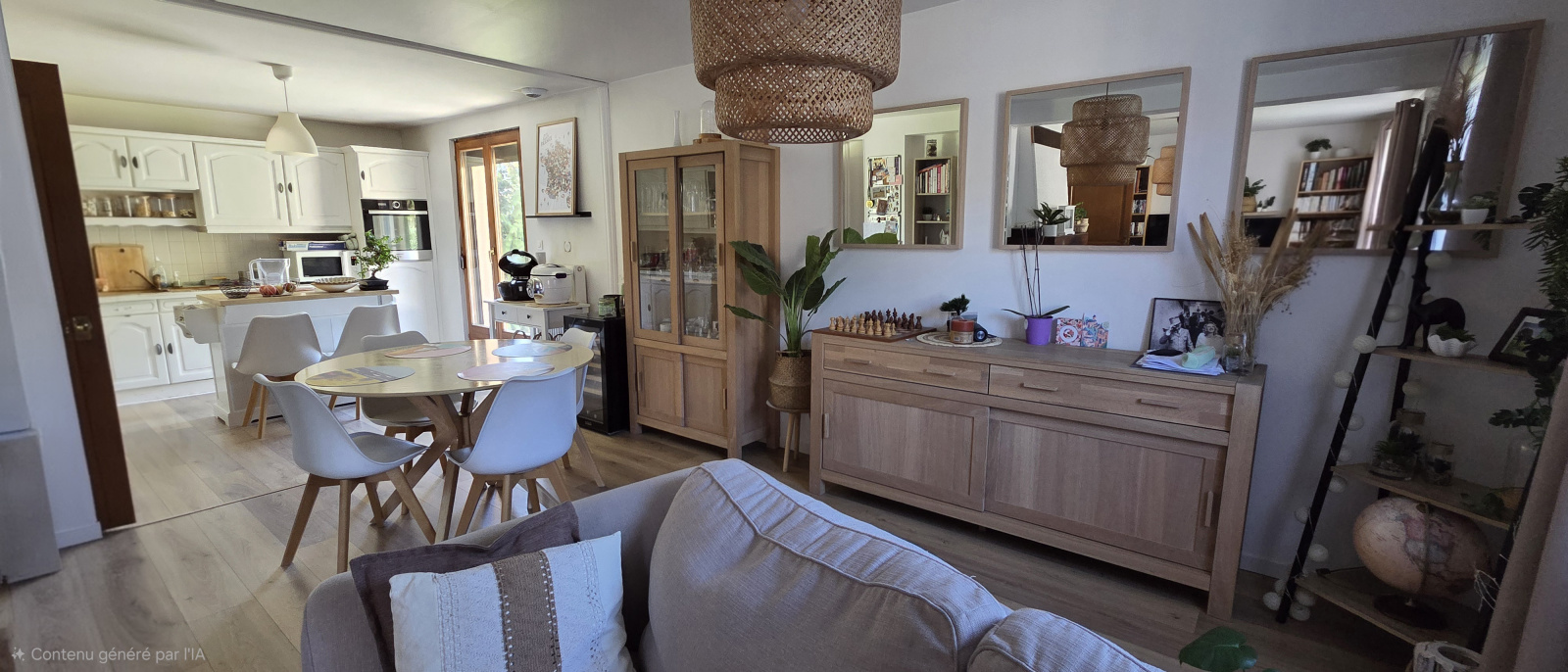 Dès l'entrée, vous serez séduits par une vaste pièce de vie ouverte sur une cuisine équipée, le tout réchauffé par une cheminée à bois pour vos soirées d'hiver.