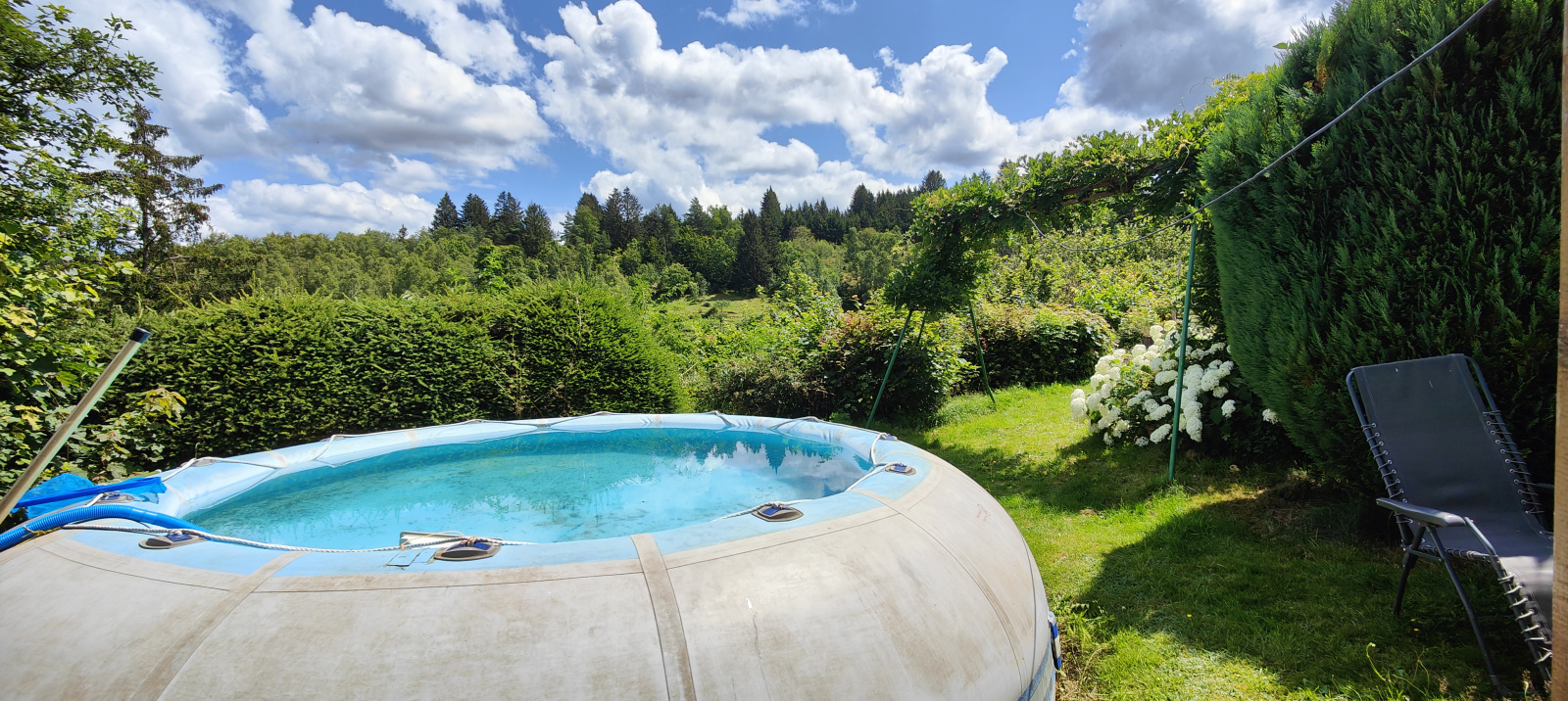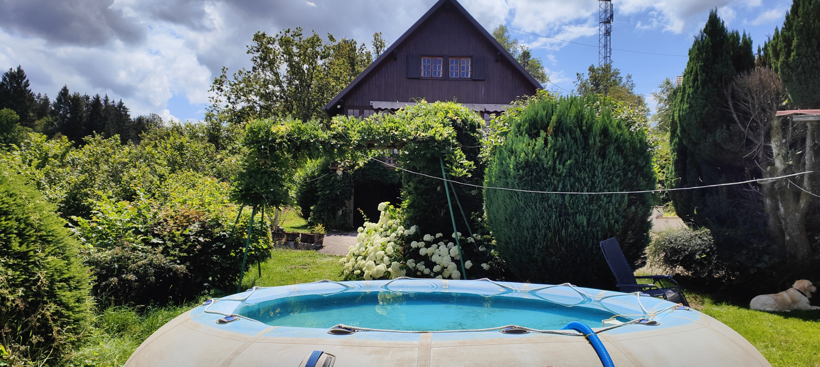 A l'extérieur, à l'avant, vous disposez de plusieurs places de stationnement puis d'un espace vert cosy avec un abri de jardin ombragé et une piscine hors-sol gonflable d'environ 3.60 m de diamètre et 1.20 m de profondeur, de quoi vous détendre au calme et au frais.