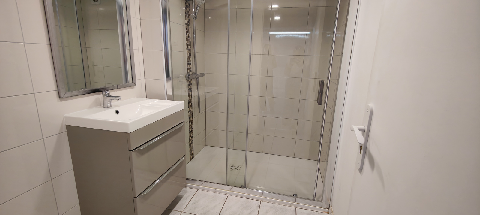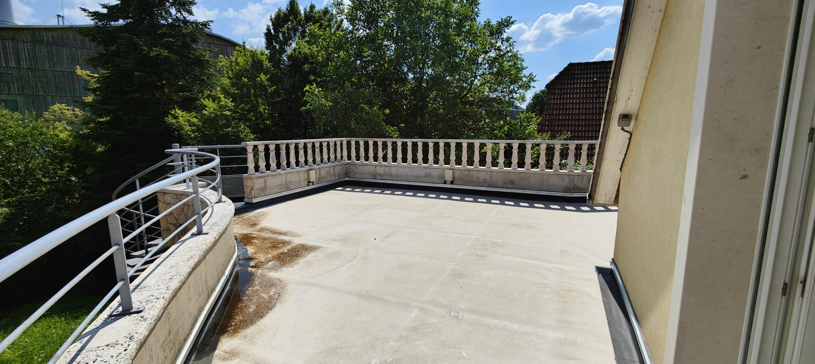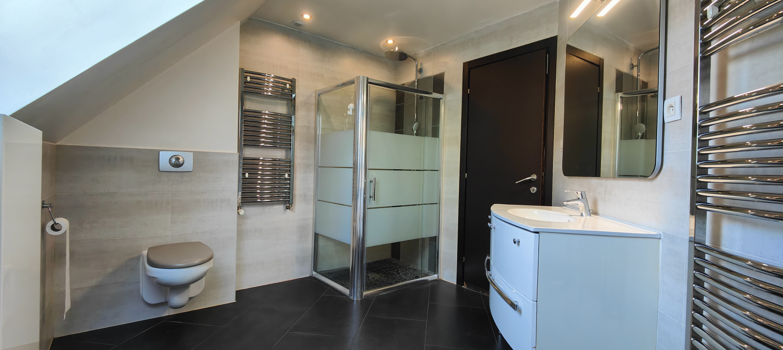 A l'étage se trouvent la salle de bain équipée et trois chambres, toutes dotées d'un placard. L'une de ces chambres profite de la très généreuse terrasse au dessus de la véranda depuis laquelle vous pouvez rejoindre votre jardin. L'étanchéité de cette terrasse est neuve.