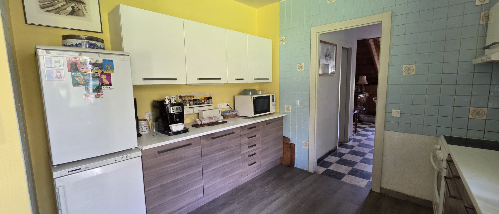 Ce type trois pièces sur deux niveaux propose une cuisine avec son poêle à bois, un salon chaleureux, deux chambres et une salle d’eau et des toilettes. Il est idéal pour recevoir des proches ou générer un revenu locatif immédiat.