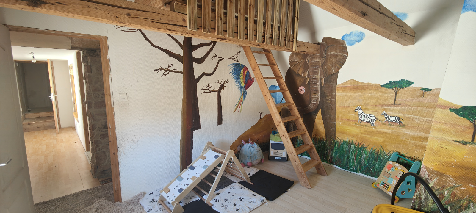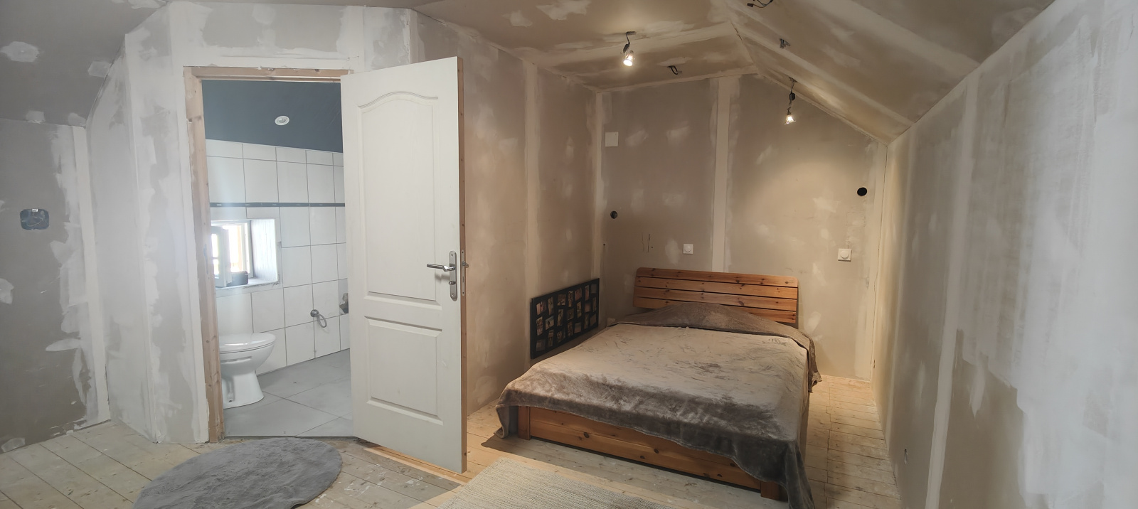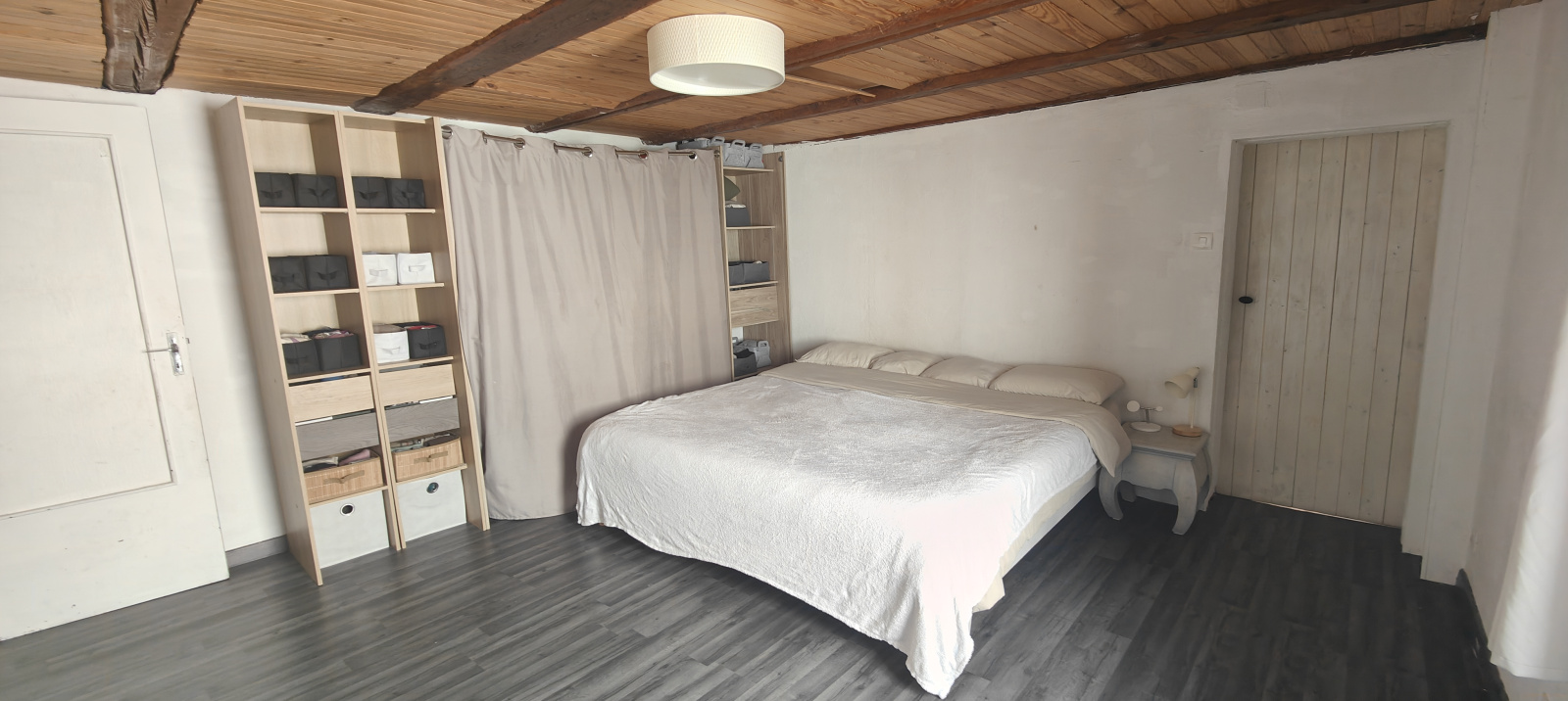Le deuxième étage se compose de trois chambres. L'une d'elles, sans fenêtre, est parfaite pour créer une salle de jeux, un dressing ou un bureau. Une autre chambre dispose d'une salle d'eau privative, dont les travaux sont à finaliser selon vos envies. Un accès direct au grenier est également disponible pour du rangement supplémentaire.