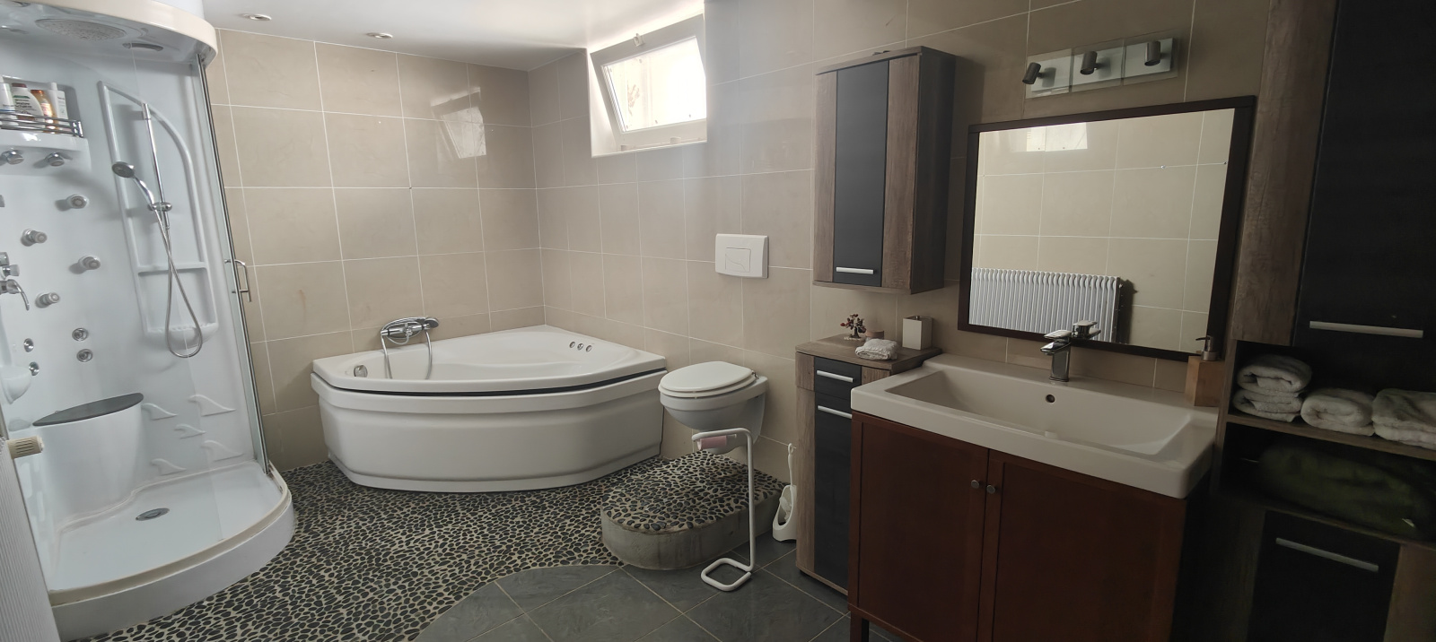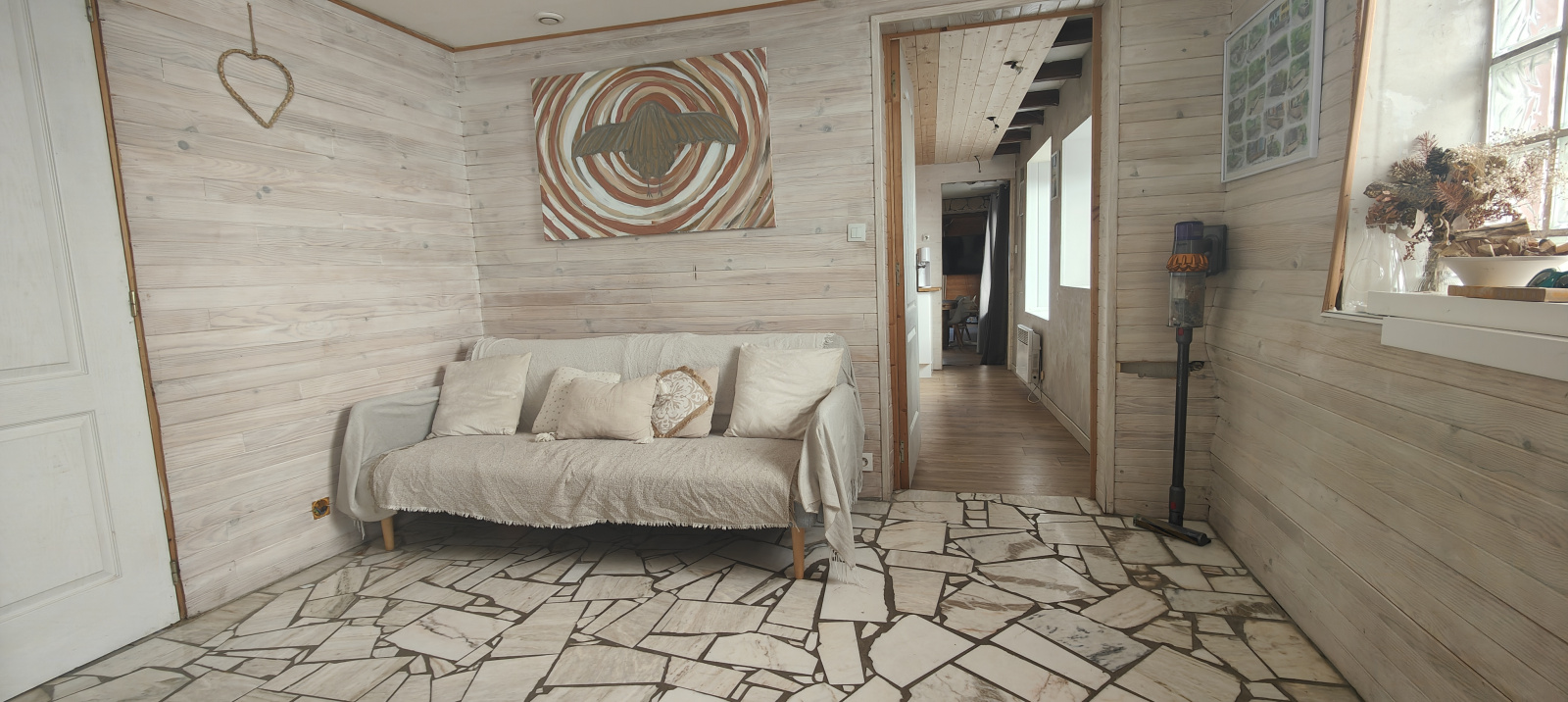 À l'étage, vous trouverez une grande chambre, une salle de bain avec toilette, ainsi qu'un vaste dégagement pouvant être aménagé en bureau ou en espace détente. Cette partie de la maison est prolongée par une magnifique véranda de 21 m², un véritable cocon pour profiter de la lumière naturelle en toutes saisons. C'est un atout précieux qui remplace un jardin avec élégance.
